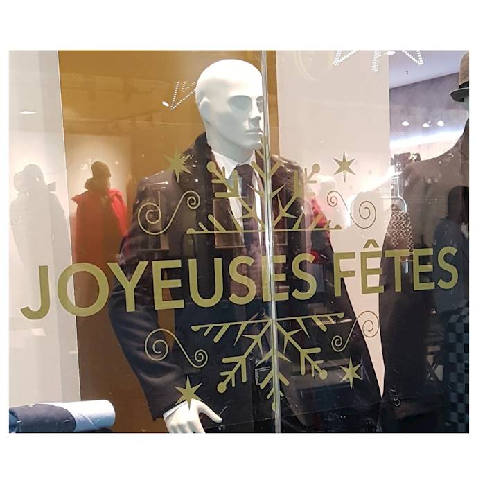 Finitions : Impression quadri haute définition sur adhésif transparent sans impression de blanc, lamination mate ou brillante. Découpe possible : formes géométriques ou à la forme. Avantages : Vinyle transparent sans colle pour une facile. Exemples d'applications : décoration de vitrines.