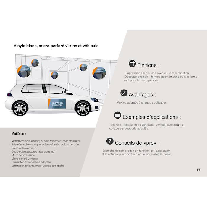Finitions : Impression quadri haute définition, lamination mate ou brillante. Découpe possible : formes géométriques ou à la forme. Avantages : Colle renfocée pour une application sur surfaces difficiles. Exemples d'applications : Marquages de conteneur tri sélectif ou autre support en ABS. Conseils de "pro" : Bien choisir son vinyle en fonction de la nature du support de destination.