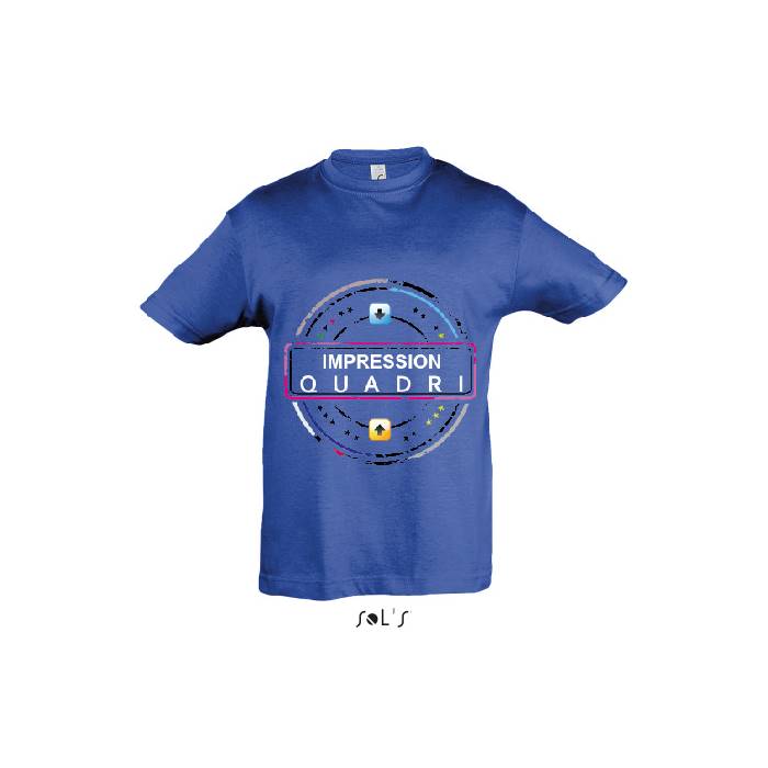 Finitions : Impression numérique quadri sur t-shirt enfant Sol's modèle Régent. Couleurs aux choix (voir fiche couleur) panachage couleur possible. Avantages : L'impression numérique haute définition avec blanc de soutien permet un rendu de couleur exceptionnel quel de soit la couleur du t-shirt. Exemples d'utilisation : Vêtements de travail, évènementiels ... Conseils de "pro" : Un lavage des t-shirts à l'envers à 30° permet un maintien de la qualité des couleurs sur du long terme.
