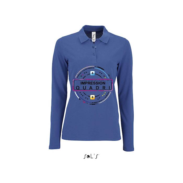 Finitions : Impression numérique quadri sur polo manche longue femme Sol's modèle Perfect LSL. Couleurs aux choix (voir fiche couleur) panachage couleur possible. Avantages : L'impression numérique haute définition avec blanc de soutien permet un rendu de couleur exceptionnel quel de soit la couleur du polo. Exemples d'utilisation : Vêtements de travail, évènementiels ... Conseils de "pro" : Un lavage des polos à l'envers à 30° permet un maintien de la qualité des couleurs sur du long terme.