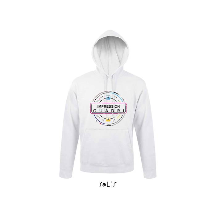 Finitions : Impression numérique quadri sur sweat (capuche) blanc homme Sol's modèle Snake. Avantages : L'impression numérique haute définition avec blanc de soutien permet un rendu de couleur exceptionnel quel que soit la couleur du sweat. Exemples d'utilisation : Vêtements de travail, évènementiels ... Conseils de "pro" : Un lavage des sweats à l'envers à 30° permet un maintien de la qualité des couleurs sur du long terme.